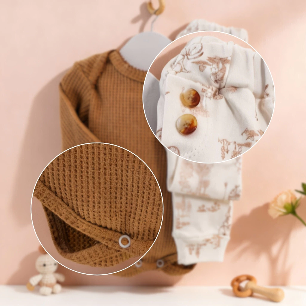 Un **Conjunto unisex** en suave **tela waffle**, perfecto para la media estación. Ofrece un **look moderno y cómodo**, con un body de cuello en pico y detalles funcionales.